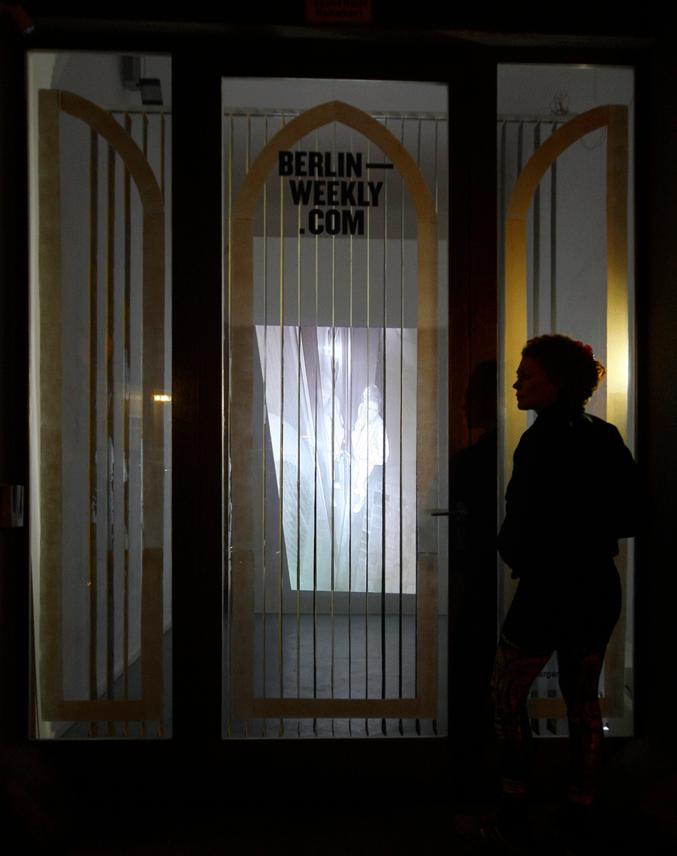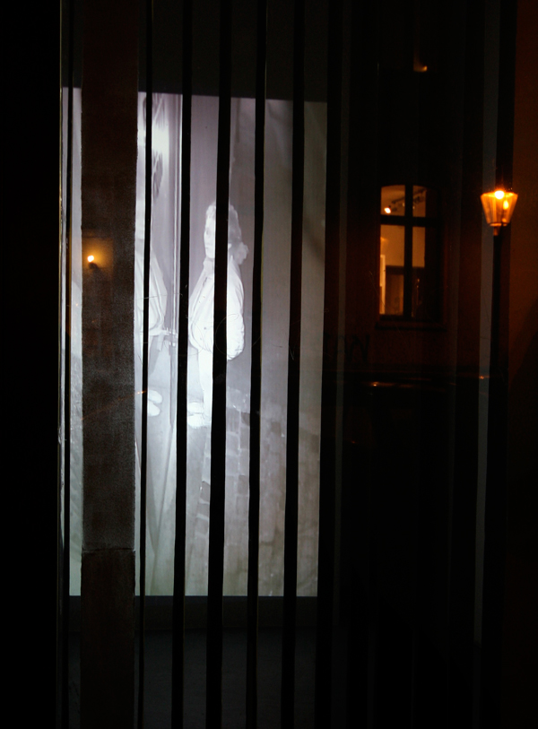 Eine Fläche wird durch Drehung ihrer Einzelteile unsichtbar und gibt den Blick auf die dritte Ebene frei. Sie reflektiert das Bild des Einsehenden in seiner Position vor dem Eingang. Die Perspektive der Aufnahme gibt Aufschluss darüber, dass dieser durch eine Kamera überwacht wird.