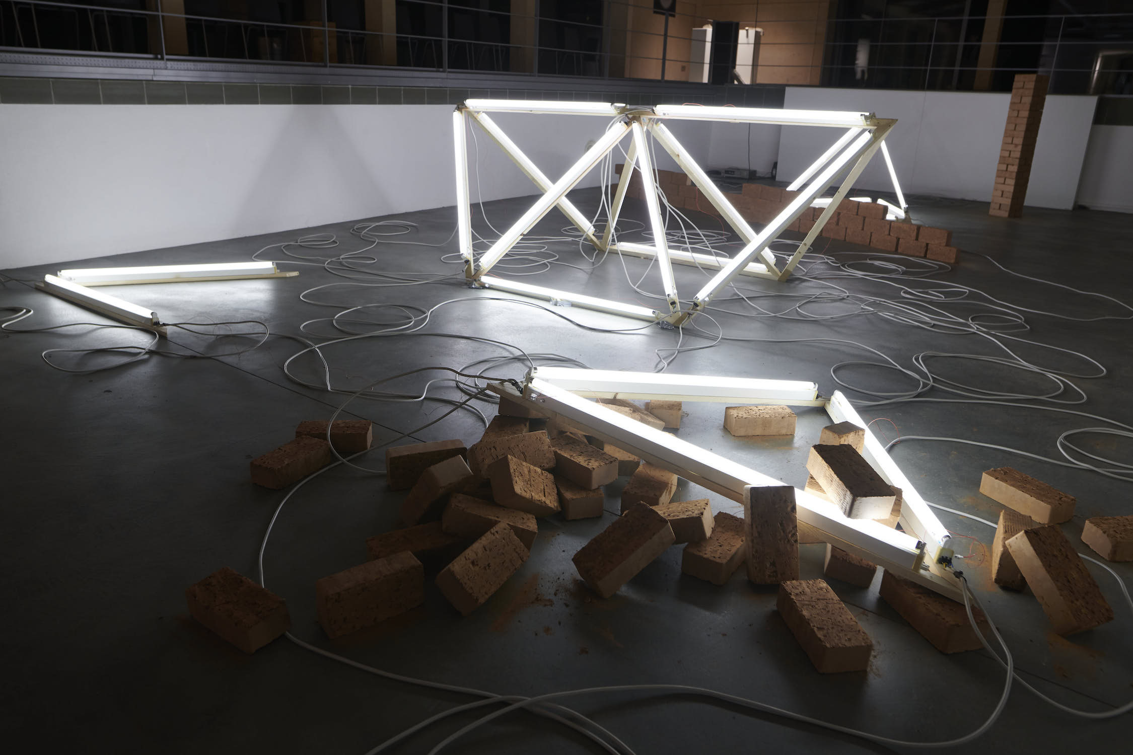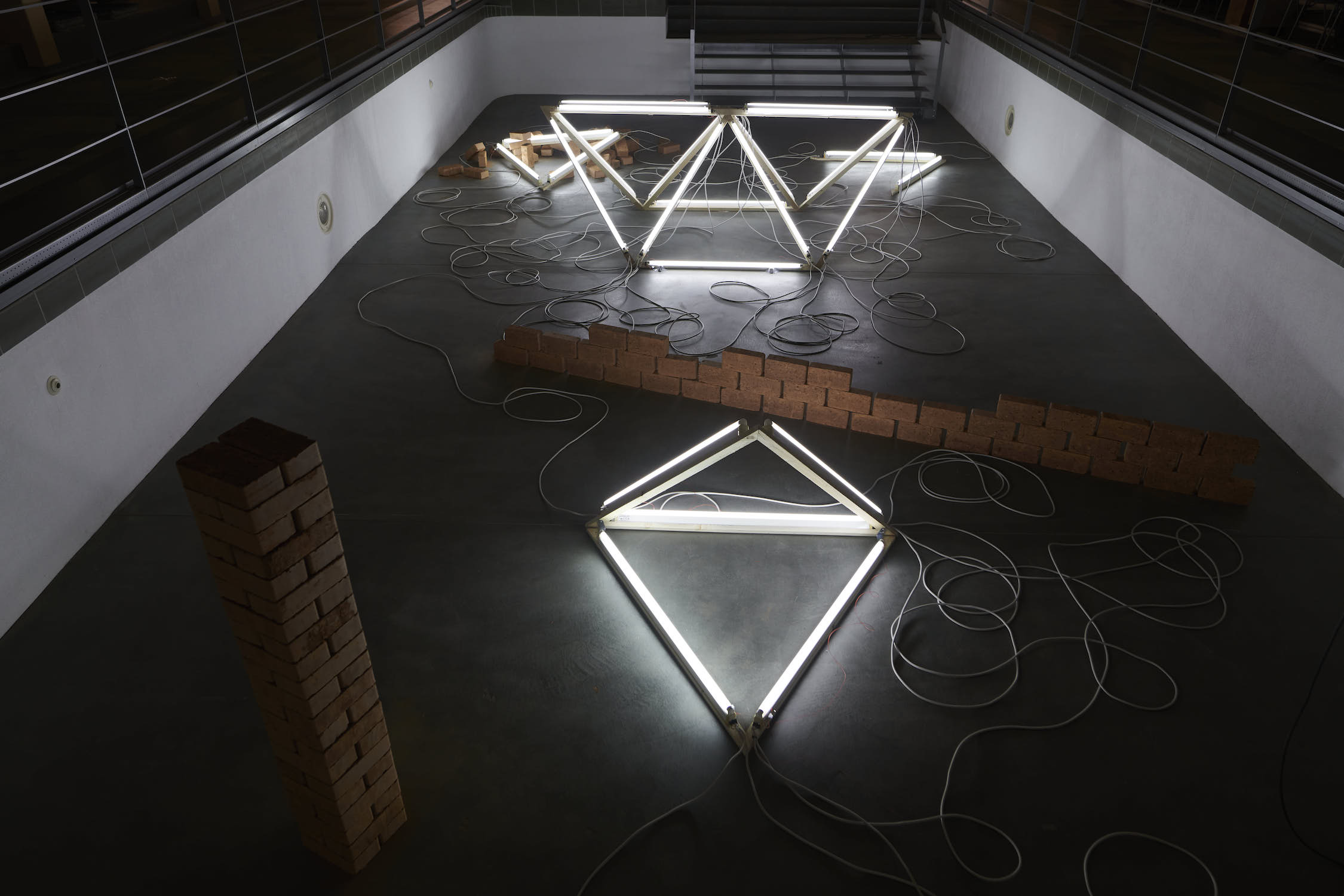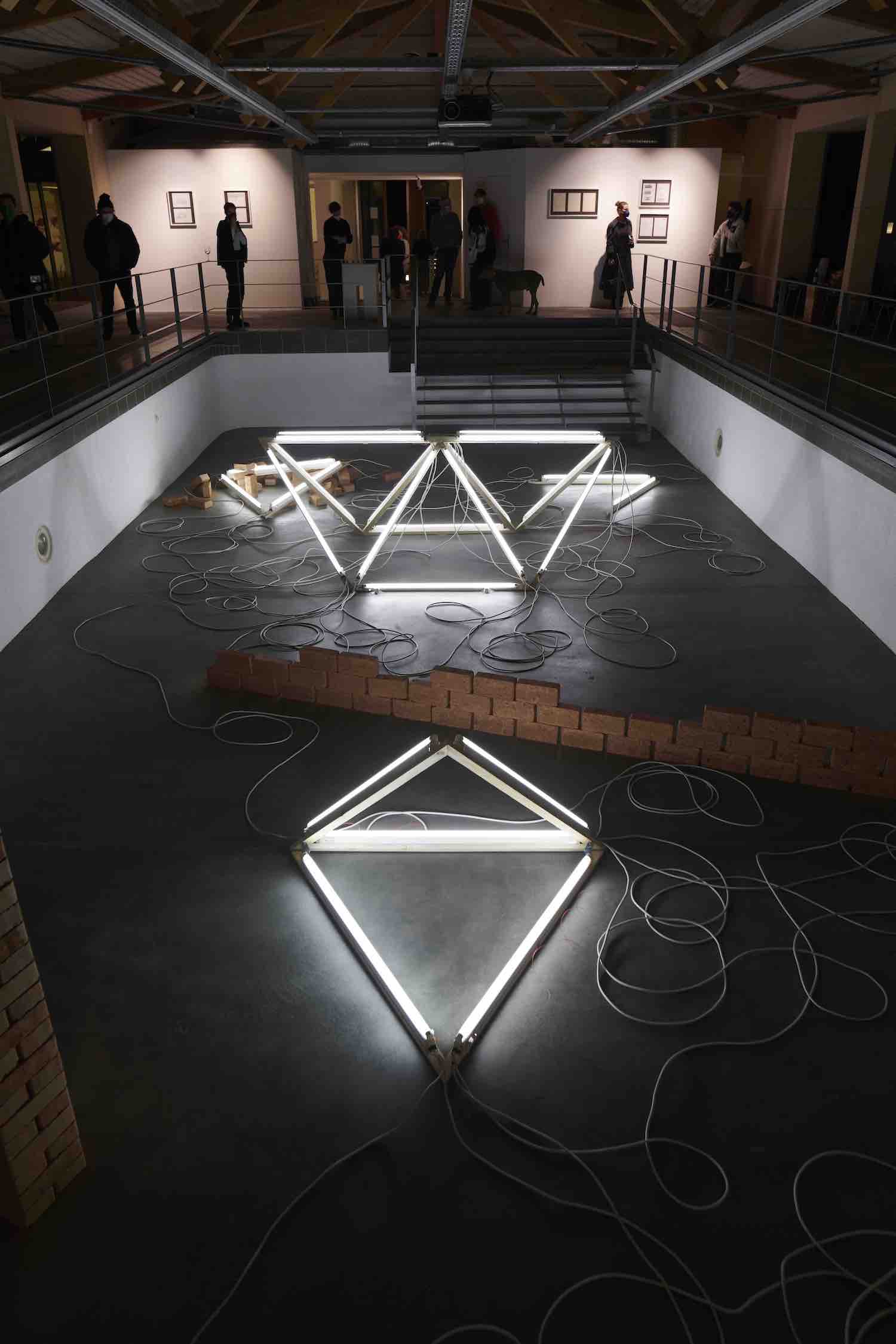 LICHT FUGE LEHM – der Dreiklang mehr oder weniger ›archaischer‹ Materialitäten verweist auf ein ästhetisches Gefüge sich durchquerender künstlerischer Bezugssysteme, das ein Zusammentreffen von Belichtung und Schatten, Konstruktion und Unberechenbarkeit, Neubeginn und Wiederkehr raumgreifend inszeniert. Der antiken Figur der Tetraktýs – einer geometrischen Repräsentation der ›vierten Dreieckszahl‹, durch die sich Pythagoras von Samos einen Schlüssel zum Verständnis der Weltharmonie versprach – kommt dabei eine prominente Rolle zu. Die Figur wird in die Arena eines trockengelegten Schwimmbeckens hineingezogen, um sich dort in einer fragmentierten Form räumlich zu aktualisieren. Die ewige Ruhe mathematischer Verbindlichkeiten wird allerdings sowohl von außen als auch aus dem Inneren der Installation empfindlich gestört. Eine Rabenkrähe beispielsweise ›drosselt‹ mehr oder weniger hörbar die Herrlichkeit eines sich lautlos verströmenden Lichts der Erkenntnis. Der stromversorgende ›Kabelsalat‹ der Lichtröhren konterkariert die allegorisch verstreuten Restbestände geometrischer Ordnung, deren Beleuchtung er zugleich möglich macht. Grünlinge aus getrocknetem Lehm schließlich, ›dämmen‹ die unaufgeräumte Ordnung gegen jede ästhetische Kohärenz, sie stellen eine permanente Neukonstruktion in Aussicht. Ganz in diesem Sinne wird das Poolhaus Blankenese von Margarethe Mast und Eva Zulauf künstlerisch ebenso okkupiert wie neujustiert. Es wird zum quasi-kultischen Schauplatz einer materialen Verschränkung gemacht, deren Fluchtlinien sich einen Weg ins vermeintlich idyllische Außen bahnen.