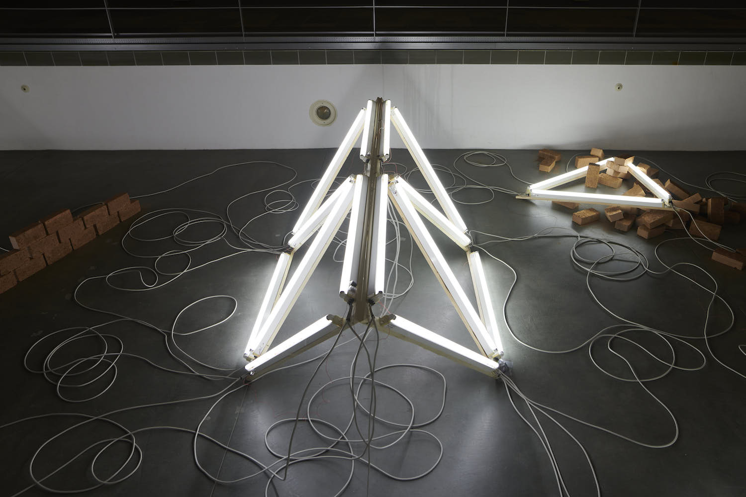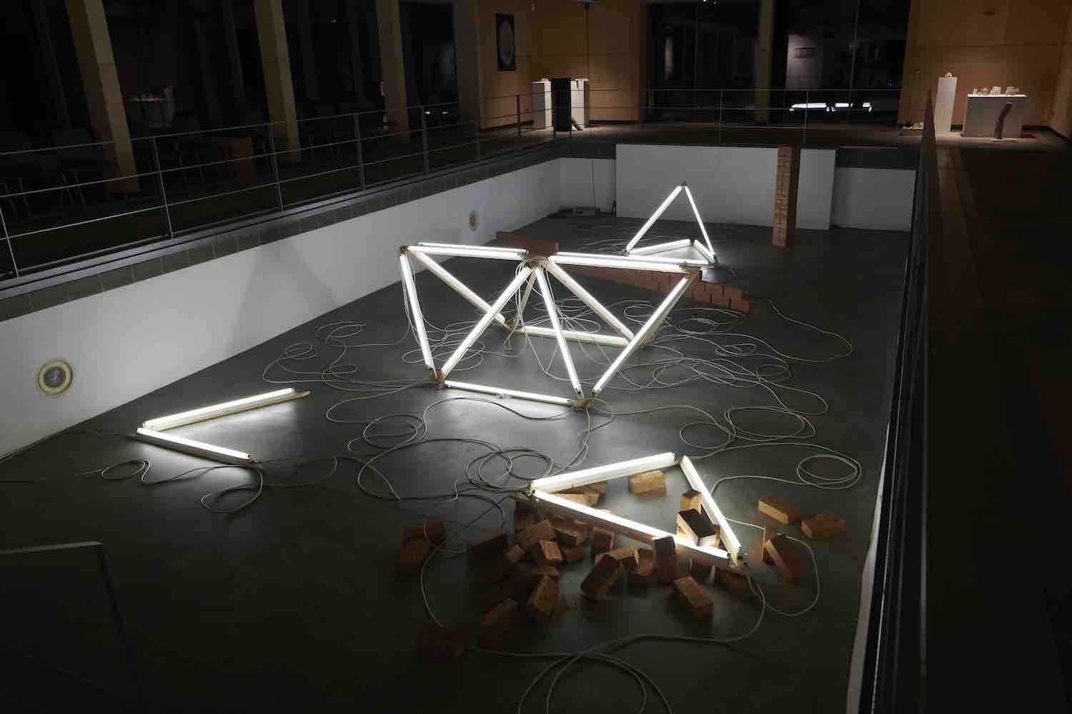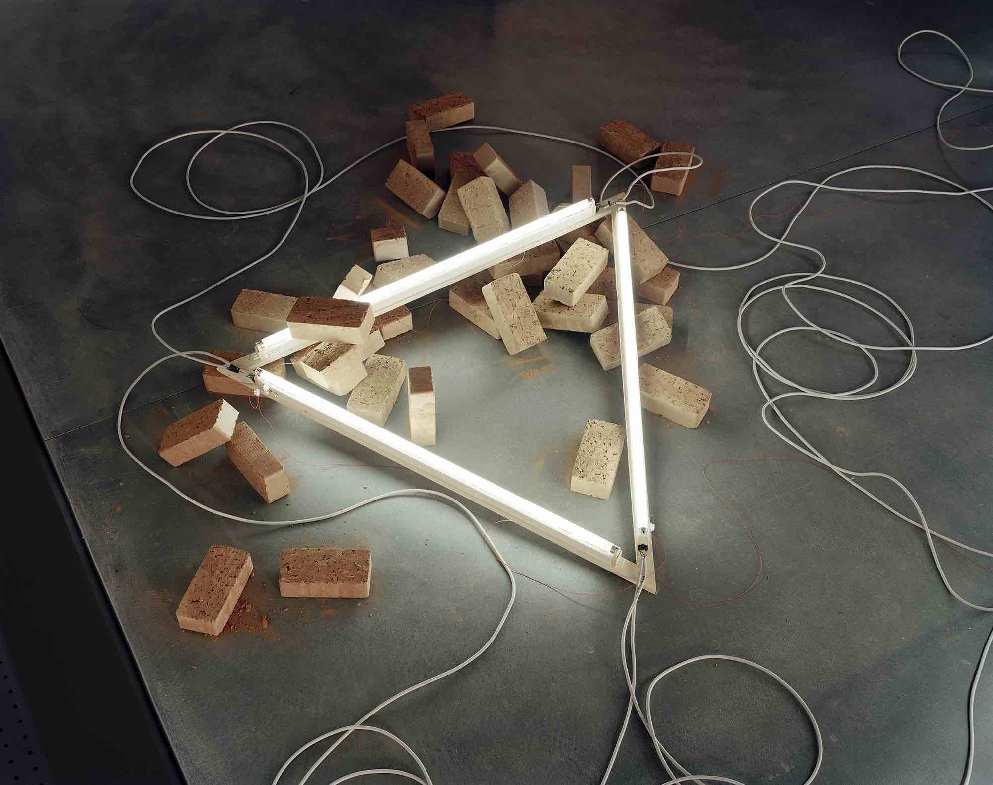 LICHT FUGE LEHM – der Dreiklang mehr oder weniger ›archaischer‹ Materialitäten verweist auf ein ästhetisches Gefüge sich durchquerender künstlerischer Bezugssysteme, das ein Zusammentreffen von Belichtung und Schatten, Konstruktion und Unberechenbarkeit, Neubeginn und Wiederkehr raumgreifend inszeniert. Der antiken Figur der Tetraktýs – einer geometrischen Repräsentation der ›vierten Dreieckszahl‹, durch die sich Pythagoras von Samos einen Schlüssel zum Verständnis der Weltharmonie versprach – kommt dabei eine prominente Rolle zu. Die Figur wird in die Arena eines trockengelegten Schwimmbeckens hineingezogen, um sich dort in einer fragmentierten Form räumlich zu aktualisieren. Die ewige Ruhe mathematischer Verbindlichkeiten wird allerdings sowohl von außen als auch aus dem Inneren der Installation empfindlich gestört. Eine Rabenkrähe beispielsweise ›drosselt‹ mehr oder weniger hörbar die Herrlichkeit eines sich lautlos verströmenden Lichts der Erkenntnis. Der stromversorgende ›Kabelsalat‹ der Lichtröhren konterkariert die allegorisch verstreuten Restbestände geometrischer Ordnung, deren Beleuchtung er zugleich möglich macht. Grünlinge aus getrocknetem Lehm schließlich, ›dämmen‹ die unaufgeräumte Ordnung gegen jede ästhetische Kohärenz, sie stellen eine permanente Neukonstruktion in Aussicht. Ganz in diesem Sinne wird das Poolhaus Blankenese von Margarethe Mast und Eva Zulauf künstlerisch ebenso okkupiert wie neujustiert. Es wird zum quasi-kultischen Schauplatz einer materialen Verschränkung gemacht, deren Fluchtlinien sich einen Weg ins vermeintlich idyllische Außen bahnen.